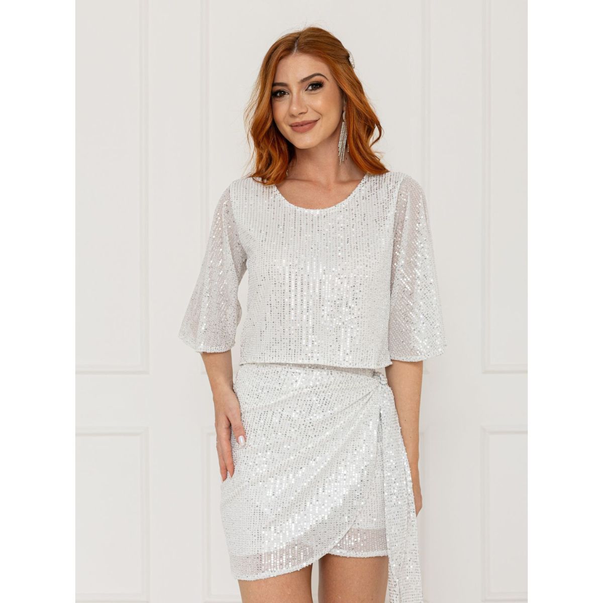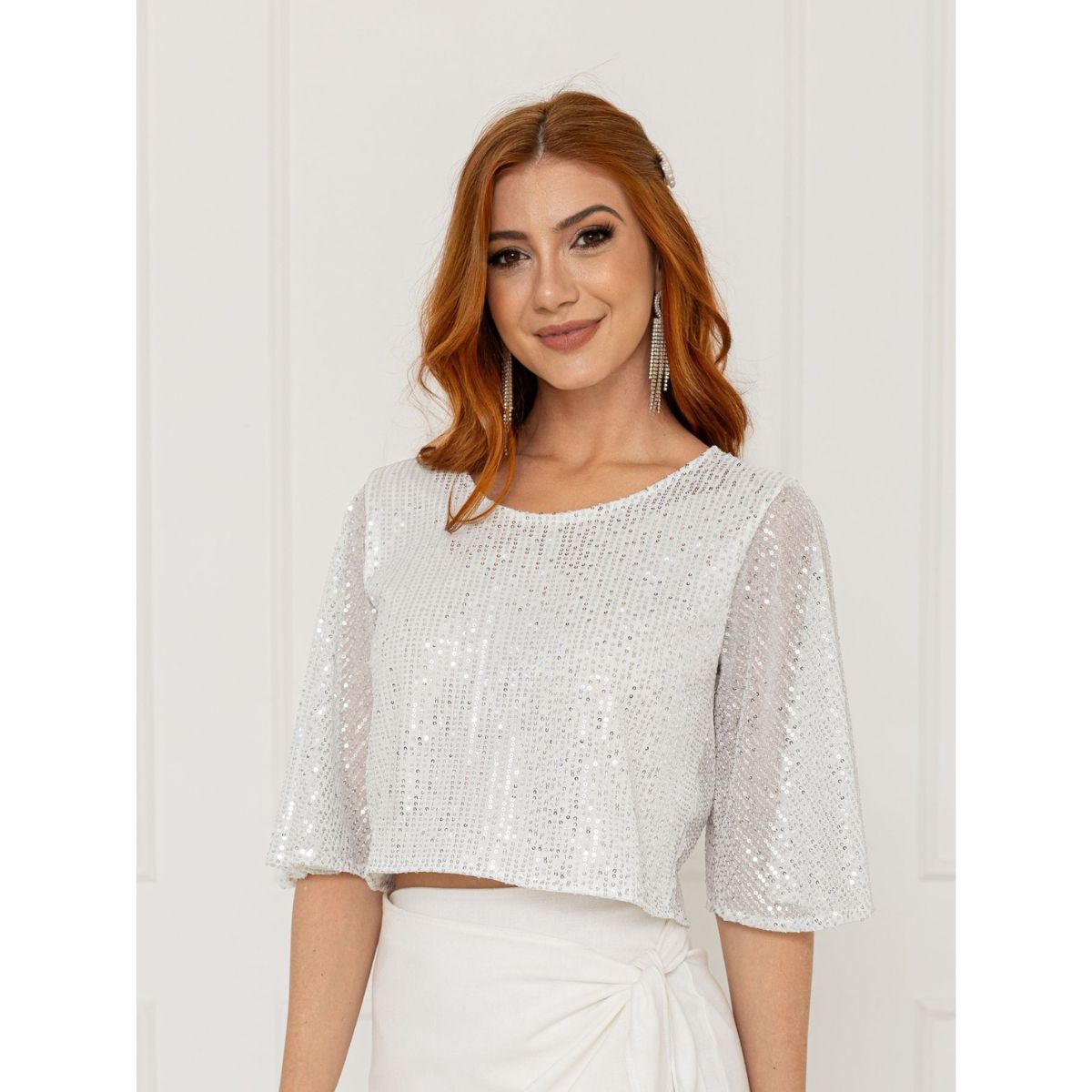 Os paetês e o corte cropped proporcionam um visual único e glamoroso.