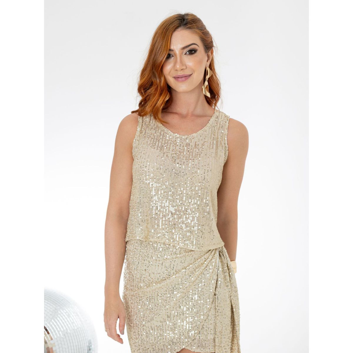 Blusa Cropped Regata Paetê Manga Curta GLOW Dourada
