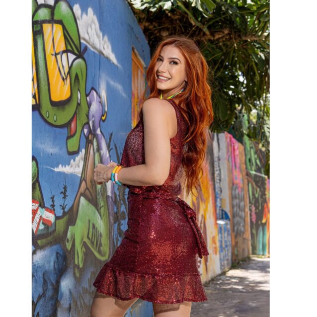 Com a Saia Curta Envelope Transpassada Paetê CARNAVALIA Vemelha Bordô, você será o destaque em qualquer celebração, esbanjando glamour e energia.