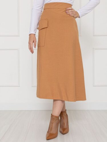 5x de R$ 29,98 s/ juros R$ 142,41no Pix Saia Midi Envelope Transpassada Linho ALLANITA Marrom Claro